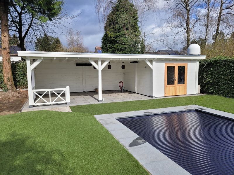 Dit ruime maatwerk buitenverblijf, gebaseerd op de Toscane, heeft een breedte van ruim 10 meter! Hierdoor is een heerlijke buitenplaats gerealiseerd waarin optimaal van het buitenleven kan worden genoten. Het buitenverblijf is wit gebeitst en voorzien van een ruime berging. Ideaal om alle tuinmeubelen en -gereedschap in op te slaan. Dankzij de heaters kan ook tijdens koudere tijden buiten worden gezeten.
