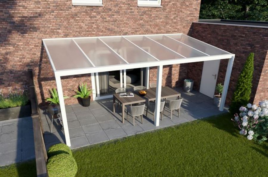 De veranda is voorzien van polycarbonaat dakbedekking. Dit heeft als voordeel dat het zeer licht, goed bewerkbaar en bovendien vrijwel onbreekbaar is. Polycarbonaat biedt meerdere opties voor een hogere zon- en hittewering. De veranda wordt ondersteund door 3 staanders.