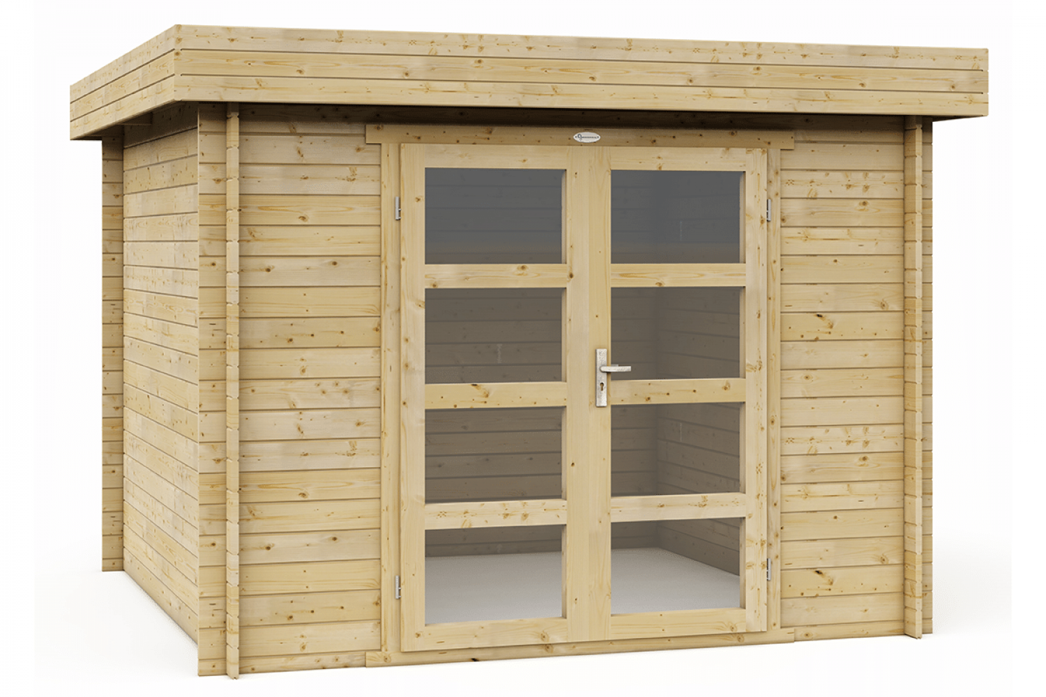 Interflex-blokhut 330M 300x300 cm geïmpregneerd is de perfecte toevoeging aan uw tuin. Het platte dak geeft een strakke uitstraling en biedt veel sfeer voor in uw tuin. Met de wind- en waterdichte hoekverbindingen blijven uw spullen veilig en droog opgeborgen staan.