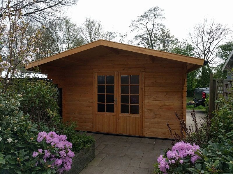 Een traditionele blokhut: de blokhut Eems. Dit tuinhuis met een wanddikte van 28 mm en zadeldak wordt opgebouwd uit Noord-Europees vurenhout. Bij dit product is gebruik gemaakt van de traditionele stapelbouwmethode met sterke hoekverbindingen. Een blokhut die stevig op de fundering staat. Aan de zijde van het zadeldak zijn dakgoten gemonteerd.