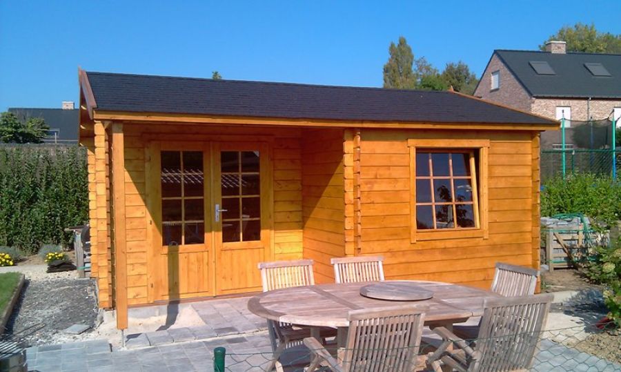 Een ruime blokhut in L-vorm met dubbele deur en aan de voorkant en zijkant voorzien van ramen. Het zadeldak loopt ook nog door als luifel bij de deur waardoor je daar een overkapping hebt voor bijvoorbeeld het tijdelijk stallen van fietsen.