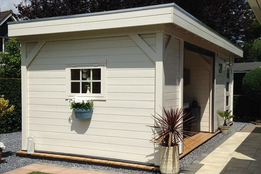 Een ruime blokhut Tapuit met luifel van 400 cm. De berging heeft een ruimte van 300x300 cm. De blokhut heeft een plat dak waaromheen een daktrim gemonteerd is. Een mooie afwerking van het dak. De luifel is aan gedeeltelijk aan de voorzijde open. Er is nog een kleine dichte wand aan de voorzijde van de blokhut. Door dit kleine hoekje zit de klant vrijwel altijd uit regen en wind. Een blokhut waar het hele jaar door genieten is!