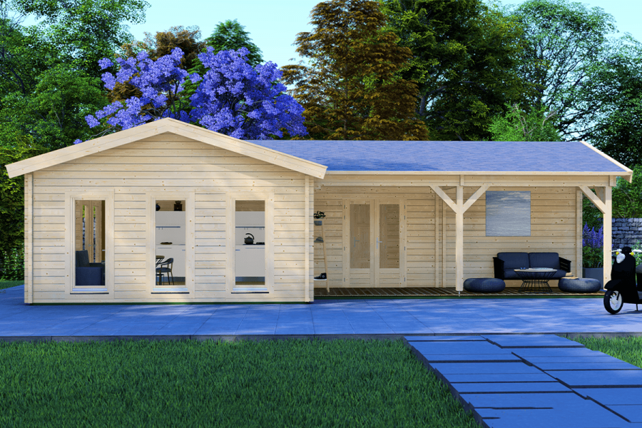 Ons model Lois is een prachtige chalet die ideaal te gebruiken is als vakantiewoning, ruim tuinverblijf of tuinkantoor. Met een omvang van 618x1118 cm heeft u meer dan voldoende ruimte om al uw dromen te verwezenlijken! De binnenruimte is opgedeeld in drie ruimtes. Zo kunt u deze chalet bijvoorbeeld voorzien van een slaapkamer, toilet of studiekamer. De keus is aan u! De 68mm wanddelen zorgen voor een robuuste uitstraling en verhogen de isolatie van uw chalet. Dankzij de overkapping bij de dubbele buitendeur ontstaat er een heerlijk plekje om buiten te zitten en met vrienden en familie te genieten van de frisse lucht, ongeacht het weer.