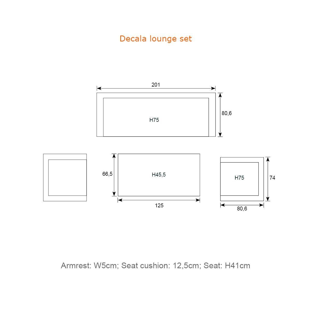 De Decala set omvat twee comfortabele loungestoelen, een driezitsbank en een loungetafel. De taupekleurige kussens zijn gemaakt van waterafstotend polyester, zodat u na een regenbui het water eenvoudig kunt afkloppen. Het reinigen van de Decala set is eenvoudig: gebruik een sopje van groene zeep en een zachte doek.