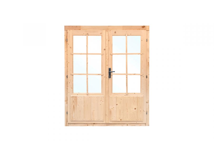 Ontdek de magie van dubbele deur D3 en laat uw buitenwereld schitteren! Compleet met kozijn, cillinderslot en enkelglas, gemaakt van onbehandeld vurenhout. Met een royale grootte van 159x190 cm en 6 prachtige ruiten per deur, straalt deze deur zowel verfijning als functionaliteit uit. Ontworpen voor wanddiktes van 28 mm tot 45 mm, opent dubbele deur D3 de poort naar nieuwe kansen. Of het nu fungeert als een betoverende ingang tot uw tuinhuis, blokhut of buitenverblijf, of als een stijlvolle tuinafscheiding, deze deur voegt een vleugje allure toe aan elke buitenruimte. Laat dubbele deur D3 uw omgeving transformeren en geef uw buitenruimte de allure die het verdient!
