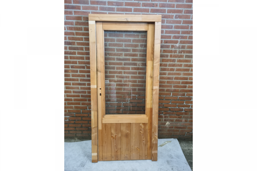 Deze mooie enkele deur van blank douglas heeft een afmeting van 192,8 x 77,9 cm en wordt geleverd met een kozijn van 199,8 x 91,4 cm. De deur heeft een sponningmaat van 86,5 cm en is voorzien van enkel glas. De deur draait links en wordt geleverd met hang- en sluitwerk. Alleen af te halen in Numansdorp.