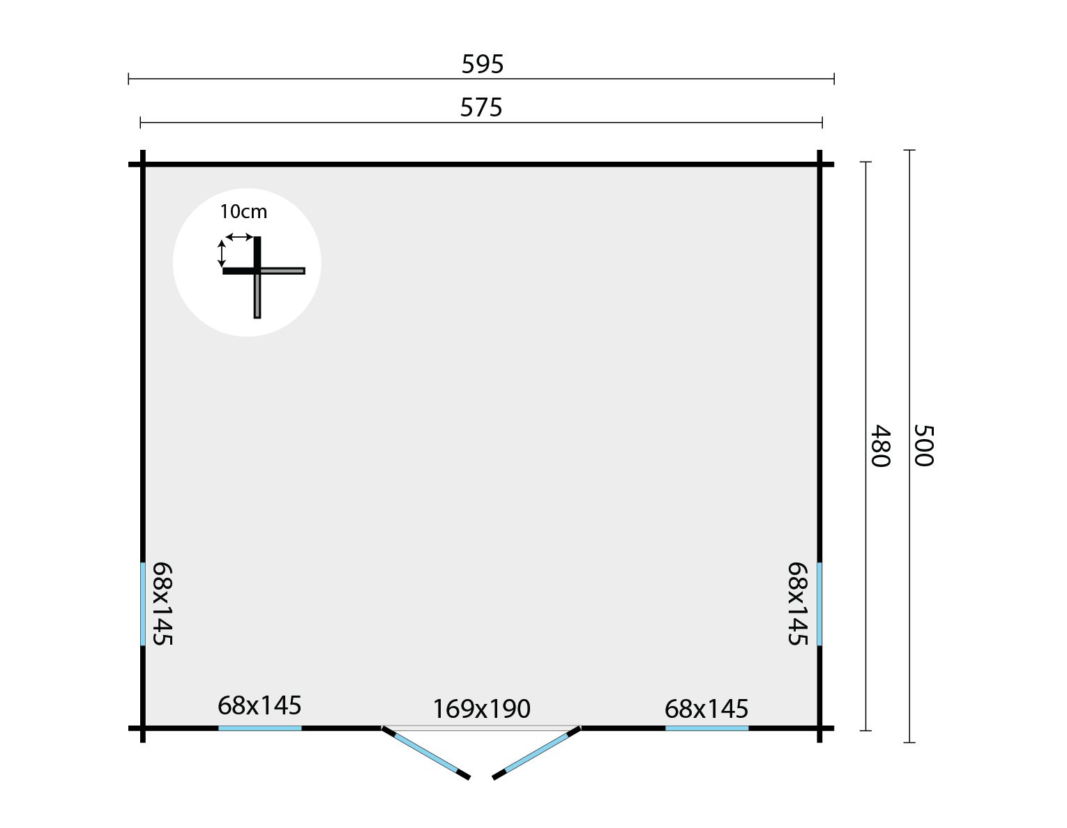 Dit tuinhuis is voorzien van dubbele deuren aan de voorzijde met glaspartijen van 169 cm bij 190 cm, die zorgen voor gemakkelijke toegang en een stijlvolle uitstraling. Daarnaast zijn er twee ramen aan de voorzijde en twee ramen aan de zijkanten, elk 68 cm bij 145 cm, die zorgen voor voldoende natuurlijk lichtinval in het interieur. De dakoversteek aan de voorzijde bedraagt 10 cm, wat niet alleen esthetisch aantrekkelijk is, maar ook extra bescherming biedt tegen weersinvloeden.