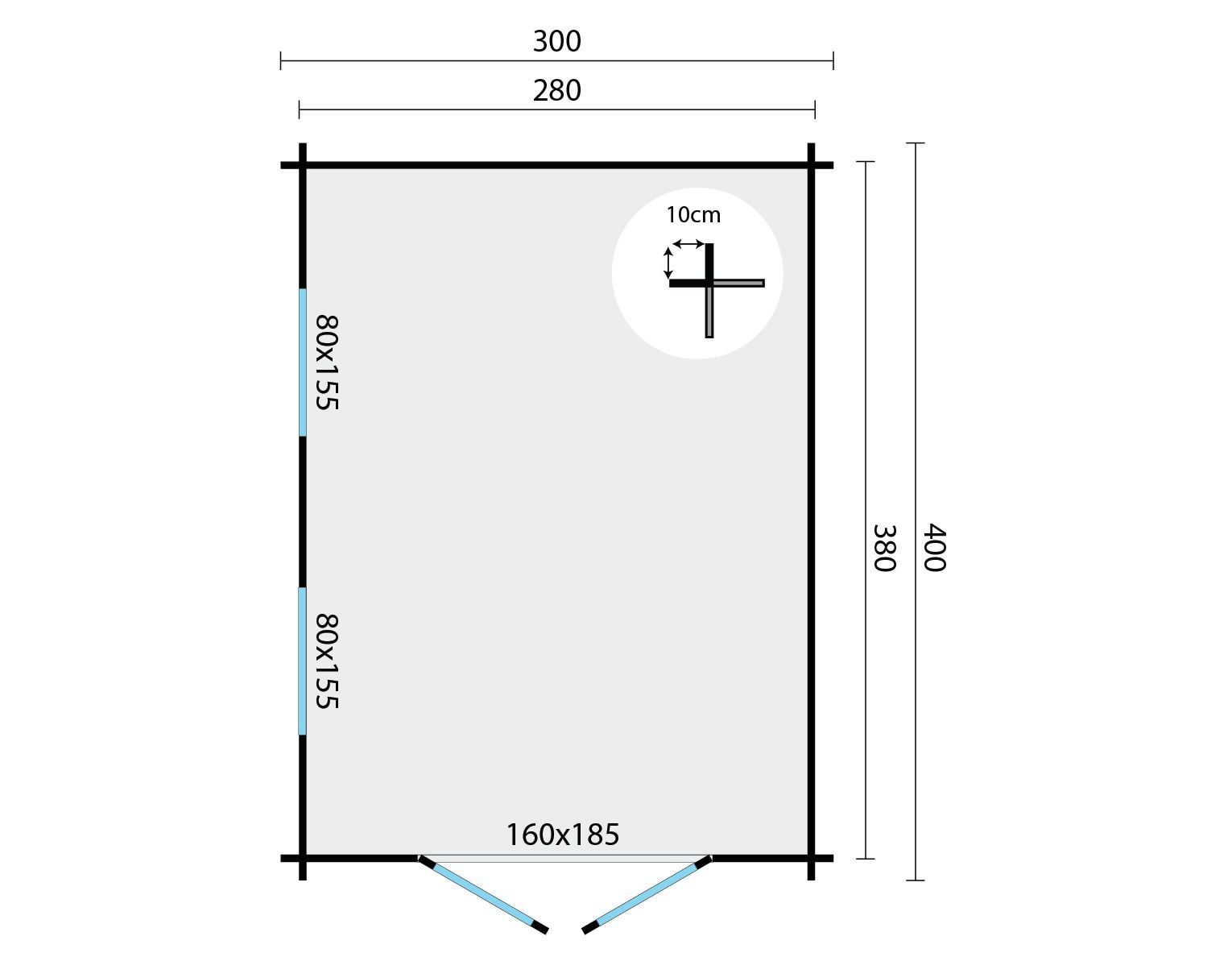 Blokhut Kerry is een compacte en veelzijdige houten constructie, ideaal voor gebruik als berging, hobbyruimte of praktische werkplek in de tuin. Met een buitenmaat van 400 cm bij 300 cm en een binnenoppervlakte van 10,6 m² biedt dit tuinhuis voldoende ruimte voor uiteenlopende toepassingen. De wanddikte van 40 mm zorgt voor een stevige basis en draagt bij aan een aangenaam binnenklimaat.